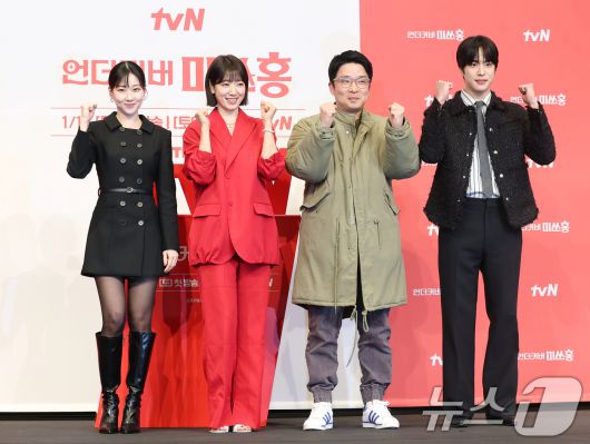 (서울=뉴스1) 권현진 기자 = 배우 하윤경(왼쪽부터)과 박신혜, 박선호 PD, 조한결이 12일 서울 구로구 더링크 호텔에서 열린 tvN 새 토일드라마 ‘언더커버 미쓰홍’(연출 박선호 / 극본 문현경) 제작발표회에 참석해 포즈를 취하고 있다. '언더커버 미쓰홍'은 1990년대 세기말, 30대 엘리트 증권감독관 홍금보(박신혜 분)가 수상한 자금의 흐름이 포착된 증권사에 20살 말단 사원으로 위장 취업하며 벌어지는 좌충우돌 레트로 오피스 코미디 드라마다. 2026.1.12/뉴스1