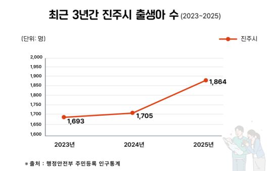 12일 진주시에 따르면 지역 출생아 수는 2023년 1693명에서 2024년 1705명, 2025년 1864명으로 2년 연속 증가했다. 지난해 출생아 수는 2021년(1736명)보다 128명이 증가(7.37%)한 수치로 경남지역 시단위 지자체 중 가장 높은 증가율 1위를 기록했다.