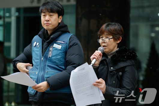 (서울=뉴스1) 안은나 기자 = 2020년 쿠팡 물류센터에서 과로로 숨진 고(故) 장덕준 씨 어머니 박미숙 씨가 12일 오후 중구 서울지방고용노동청 앞에서 쿠팡 창업자 김범석 의장을 산업안전보건법 위반으로 고발한 건과 관련, 고발인 조사를 받기 전 발언하고 있다. 왼쪽은 강민욱 택배노조 쿠팡본부 준비위원장. 2026.1.12/뉴스1