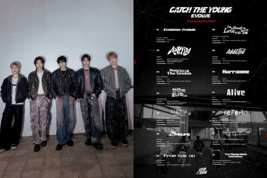 캐치더영(산이·기훈·남현·준용·정모)이 12일 0시 정규 1집 '이볼브'(EVOLVE) 트랙 리스트를 공개한 결과, 이번 앨범에는 타이틀곡 '앰플리파이'(Amplify)를 포함해 총 14곡이 수록됐다.