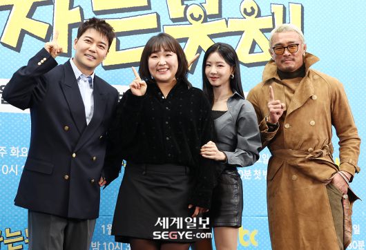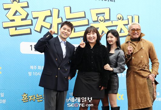 방송인 전현무, 이수지, 이세희, 추성훈(사진 왼쪽부터)이 12일 서울 마포구 상암동 스탠포드 호텔에서 열린 JTBC ‘혼자는 못 해’의 제작발표회에 참석해 포즈를 취하고 있다.