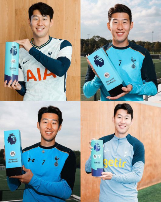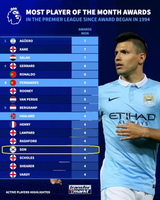 현재 홀란과 함께 4회 수상한 선수 중엔 '대한민국 캡틴' 손흥민도 있다. '트랜스퍼마르크트' 이미지에는 잉글랜드 국기 사이에 태극기가 딱 박혀있다. 손흥민은 2015년부터 2025년까지 토트넘 유니폼을 입고 뛰면서 2016년 9월, 2017년 4월, 2020년 10월, 2023년 9월 총 4번 이달의 선수상의 영예를 안았다.