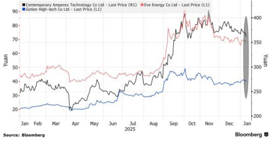1월12일 CATL(닝더스다이)은 한때 4.8%까지 떨어지며 MSCI 차이나 지수 구성 종목 가운데 최악 수준의 성적을 냈다. 이브에너지(Eve Energy), 궈쉬안 하이테크(Gotion High-Tech) 등 중소형 배터리 업체들도 장중 4% 넘게 밀렸다.