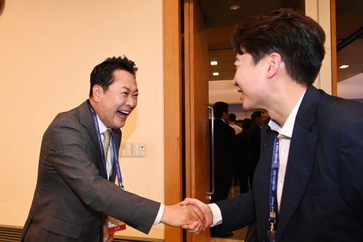 지난해 8월 26일 서울 중구 대한상공회의소에서 열린 ‘문화미래리포트(MFR) 2025 트러피즘 향방과 대한민국의 선택’ 국제 포럼에서 국민의힘 장동혁(왼쪽) 대표와 개혁신당 이준석 대표가 인사를 나누고 있다. 2025.8.26 국회사진기자단 |