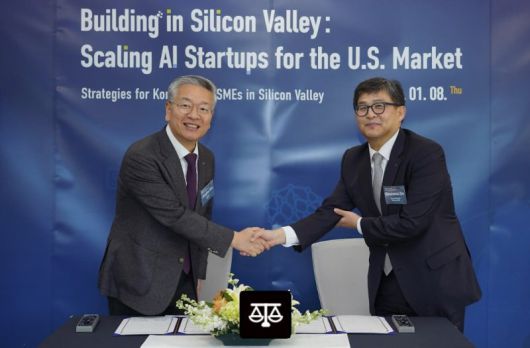 지난 8일(현지시간) 미국 실리콘밸리에 위치한 기술보증기금 실리콘밸리지점에서 진행된 북미 진출 국내기업 금융지원 확대를 위한 업무협약식에서 도건우 신한은행 미주지역본부장(오른쪽)과 김종호 기술보증기금 이사장이 기념촬영을 하고 있다. 신한은행 제공 |