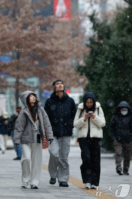 (서울=뉴스1) 안은나 기자 = 12일 오후 서울 중구 을지로에서 관광객들이 눈을 맞으며 걸어가고 있다. 2026.1.12/뉴스1coinlocker@news1.krCopyright ⓒ 뉴스1. All rights reserved. 무단 전재 및 재배포, AI학습 이용 금지.