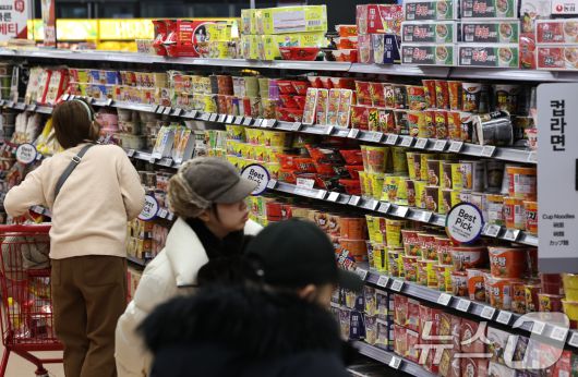 (서울=뉴스1) 구윤성 기자 = 12일 서울의 한 대형마트에서 외국인 관광객들이 라면을 구입하고 있다. 농림축산식품부가 이날 발표한 ’2025년 케이-푸드 플러스(K-푸드+) 수출 실적’에 따르면, 한국산 식품·농산물 수출액이 136억2000만달러(약 19조4000억원)를 기록하며 역대 최고치를 경신했다. 전체 수출액은 전년 대비 5.1%(6억6000만달러) 늘었다. 농식품 수출이 104억1000만달러, 농산업 수출이 32억2000만달러를 기록했다. 품목 별로는 라면 수출이 15억2000만달러로 전년 대비 21.9% 급증하며 전체 수출 증가를 이끌었다. 이어 소스류(9억2000만달러·5% 증가)와 김치(1억6000만달러·4.6% 증가), 아이스크림(1억1000만달러·21.6% 증가), 포도(8470만달러·6.3% 증가), 딸기(7200만달러·4.0% 증가) 등 12개 품목도 역대 최고 수출액을 기록했다. 2026.1.12/뉴스1
