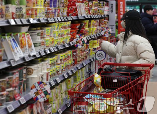 (서울=뉴스1) 구윤성 기자 = 12일 서울의 한 대형마트에서 외국인 관광객들이 라면을 구입하고 있다. 농림축산식품부가 이날 발표한 ’2025년 케이-푸드 플러스(K-푸드+) 수출 실적’에 따르면, 한국산 식품·농산물 수출액이 136억2000만달러(약 19조4000억원)를 기록하며 역대 최고치를 경신했다. 전체 수출액은 전년 대비 5.1%(6억6000만달러) 늘었다. 농식품 수출이 104억1000만달러, 농산업 수출이 32억2000만달러를 기록했다. 품목 별로는 라면 수출이 15억2000만달러로 전년 대비 21.9% 급증하며 전체 수출 증가를 이끌었다. 이어 소스류(9억2000만달러·5% 증가)와 김치(1억6000만달러·4.6% 증가), 아이스크림(1억1000만달러·21.6% 증가), 포도(8470만달러·6.3% 증가), 딸기(7200만달러·4.0% 증가) 등 12개 품목도 역대 최고 수출액을 기록했다. 2026.1.12/뉴스1