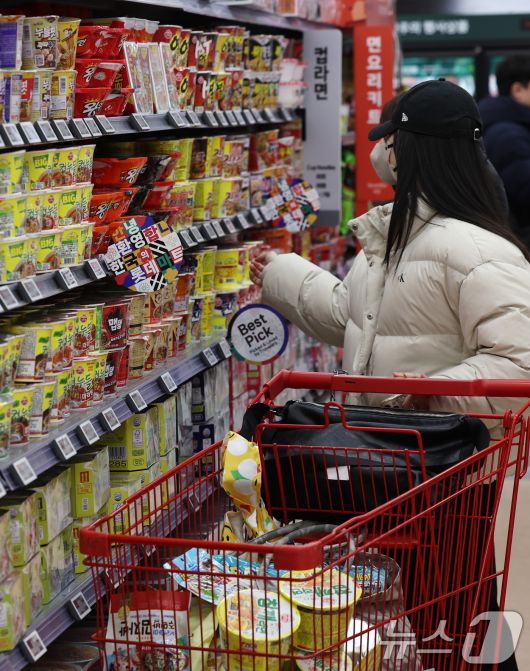 (서울=뉴스1) 구윤성 기자 = 12일 서울의 한 대형마트에서 외국인 관광객들이 라면을 구입하고 있다. 농림축산식품부가 이날 발표한 ’2025년 케이-푸드 플러스(K-푸드+) 수출 실적’에 따르면, 한국산 식품·농산물 수출액이 136억2000만달러(약 19조4000억원)를 기록하며 역대 최고치를 경신했다. 전체 수출액은 전년 대비 5.1%(6억6000만달러) 늘었다. 농식품 수출이 104억1000만달러, 농산업 수출이 32억2000만달러를 기록했다. 품목 별로는 라면 수출이 15억2000만달러로 전년 대비 21.9% 급증하며 전체 수출 증가를 이끌었다. 이어 소스류(9억2000만달러·5% 증가)와 김치(1억6000만달러·4.6% 증가), 아이스크림(1억1000만달러·21.6% 증가), 포도(8470만달러·6.3% 증가), 딸기(7200만달러·4.0% 증가) 등 12개 품목도 역대 최고 수출액을 기록했다. 2026.1.12/뉴스1