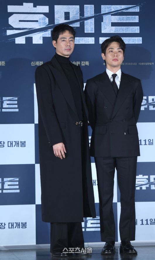 조인성, 박정민이 12일 서울 성동구 롯데시네마 건대입구에서 열린 영화 ‘휴민트’ 제작보고회에서 포즈를 취하고 있다.