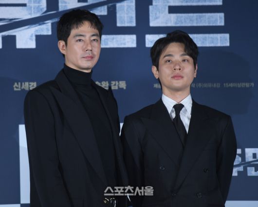 조인성, 박정민이 12일 서울 성동구 롯데시네마 건대입구에서 열린 영화 ‘휴민트’ 제작보고회에서 포즈를 취하고 있다.