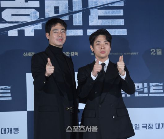 조인성, 박정민이 12일 서울 성동구 롯데시네마 건대입구에서 열린 영화 ‘휴민트’ 제작보고회에서 포즈를 취하고 있다.