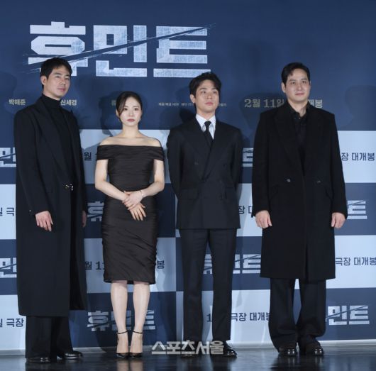조인성, 신세경, 박정민, 박해준이 12일 서울 성동구 롯데시네마 건대입구에서 열린 영화 ‘휴민트’ 제작보고회에서 포즈를 취하고 있다.