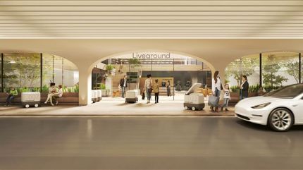 먼저 차량 승하차 공간과 로봇 서비스를 결합해 입주민이 차량을 세우면 승하차 지점에서 대기하던 생활 로봇이 차량에서 커뮤니티 라운지 내부까지 짐을 옮겨줍니다.