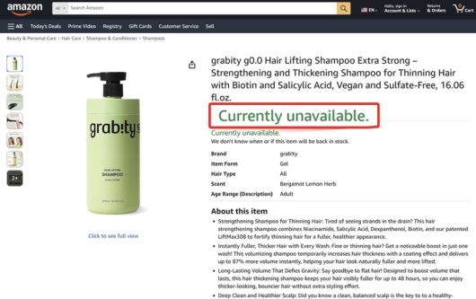 그래비티샴푸가 품절됐다고 표시된 미국 아마존 화면. 그래비티샴푸 제공 |