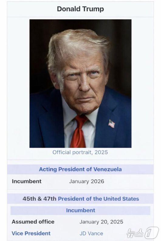 이는 조작된 이미지로, 실제 위키피디아에서는 트럼프 대통령을 베네수엘라 대통령 권한대행이라고 표기하지 않는다.