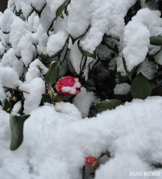 /신영삼 기자 광주 전남지역에 주말 동안 최고 10㎝ 이상의 적설량을 기록한 가운데 12일 아침, 전남 해남읍의 한 아파트 단지 화단에 흰 눈에 덮인 빨간 동백이 아름다움을 뽐내고 있다.