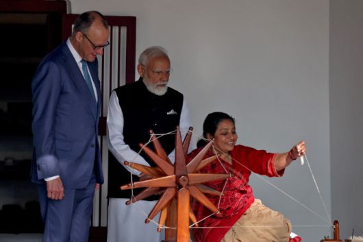 [아메다바드=뉴스핌] 홍우리 특파원 = 12일 프리드리히 메르츠 독일 총리와 나렌드라 모디 인도 총리가 인도 서부 구자라트주 아메다바드의 마하트마 간디 기념관에서 한 여성이 물레로 면사를 짓는 모습을 지켜보고 있다. 2026.01.12 hongwoori84@newspim.com |