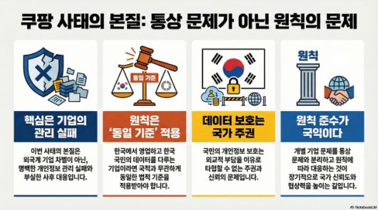 이번 사안의 본질은 명확하다. 기업의 개인정보 관리 실패와 그 이후 대응의 부실이다. 이는 책임의 문제다. 한국에서 영업하고 한국 국민의 데이터를 다루는 기업이라면 동일한 기준을 적용받는 것이 상식이다. 이를 미국 기업에 대한 차별로 해석하거나 통상 압박의 소재로 끌고 가는 것은 사안의 본질을 왜곡하는 일이다.