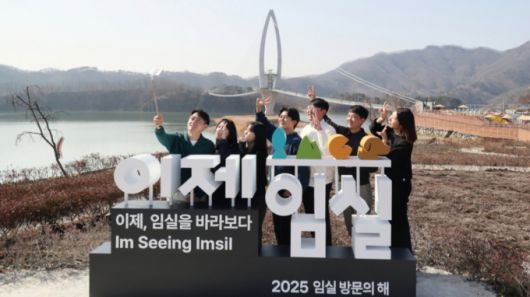 지난해 3월 전북 임실군 옥정호 요산공원에 설치된 '임실 방문의 해' 포토존 앞에서 사진 촬영 중인 관광객 모습. /사진=뉴스1(임실군 제공) |