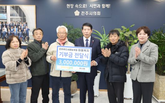 전북 전주시의회는 12일 의장실에서 남관우 의장과 온혜정 의원(우아1·2,호성동), 전북친환경유통사업단 유기수 대표 등이 참석한 가운데 전주푸드사랑농부들 아동복지 기부금 전달식을 했다. 기부금은 전북친환경유통사업단의 지역 취약계층 아동을 위한 먹거리 돌봄 사업 등에 사용할 예정이다.