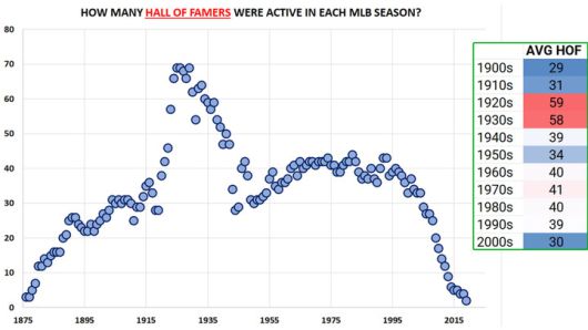 이 분석은 "명예의 전당 입성이 쉬워졌다"는 통념과 달리, 실제로는 현대 야구에서 그 문턱이 여전히 높다는 점을 강조한다. 팀 수가 늘고 선수 풀이 커졌음에도 불구하고, 매 시즌 명예의 전당급 선수로 분류되는 인원은 과거에 비해 줄어들고 있기 때문이다.