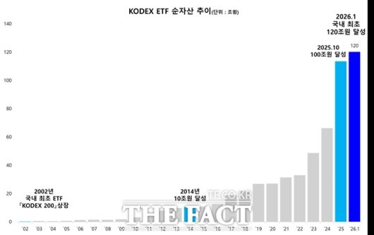 [더팩트ㅣ장혜승 기자] 삼성자산운용은 12일 KODEX ETF 순자산이 9일 종가 기준 120조5343억원으로 120조원을 돌파했다고 밝혔다. 지난해 10월 국내 최초로 순자산 100조원을 넘어선지 86일 만에 20조원 이상 가파르게 성장한 것이다.