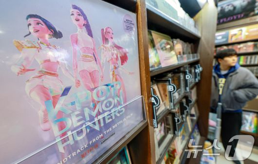 (서울=뉴스1) 이호윤 기자 = 넷플릭스 애니메이션 케이팝 데몬 헌터스(케데헌)이 11일(현지시간) 미국 제83회 골든글로브 시상식에서 장편 애니메이션상과 주제가상을 동시에 받으며 2관왕을 차지했다. 사진은 12일 서울 종로구 교보문고 광화문점에 케이팝 데몬 헌터스 음반이 진열된 모습. 2026.1.12/뉴스1