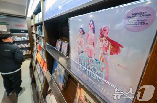(서울=뉴스1) 이호윤 기자 = 넷플릭스 애니메이션 케이팝 데몬 헌터스(케데헌)이 11일(현지시간) 미국 제83회 골든글로브 시상식에서 장편 애니메이션상과 주제가상을 동시에 받으며 2관왕을 차지했다. 사진은 12일 서울 종로구 교보문고 광화문점에 케이팝 데몬 헌터스 음반이 진열된 모습. 2026.1.12/뉴스1