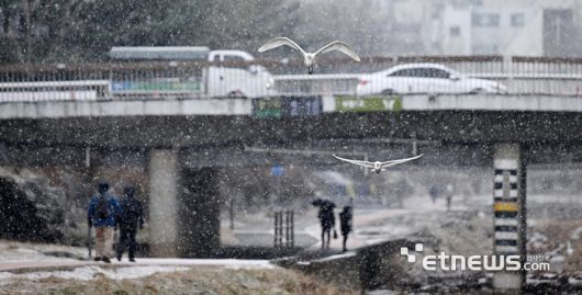 중부지방을 중심으로 눈이 내린 12일 경기 과천시 양재천 부림교 일대에서 백로가 날아오르고 있다. 이동근기자 foto@etnews.com [Copyright © 전자신문. 무단전재-재배포금지]