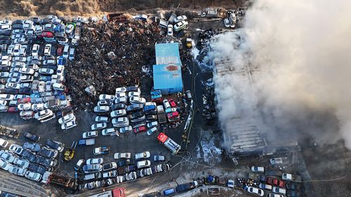 (거제=연합뉴스) 정종호 기자 = 12일 오전 7시 52분께 경남 거제시 장평동 한 폐차장에서 불이 나 약 4시간 만에 꺼졌다.