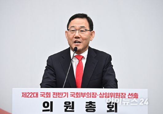 국회부의장 후보자로 선출된 국민의힘 주호영 의원이 27일 오전 서울 여의도 국회에서 열린 제22대 국회 전반기 당 국회부의장·상임위원장 후보자 선출 의원총회에서 당선인사를 하고 있다. [사진=곽영래 기자] |