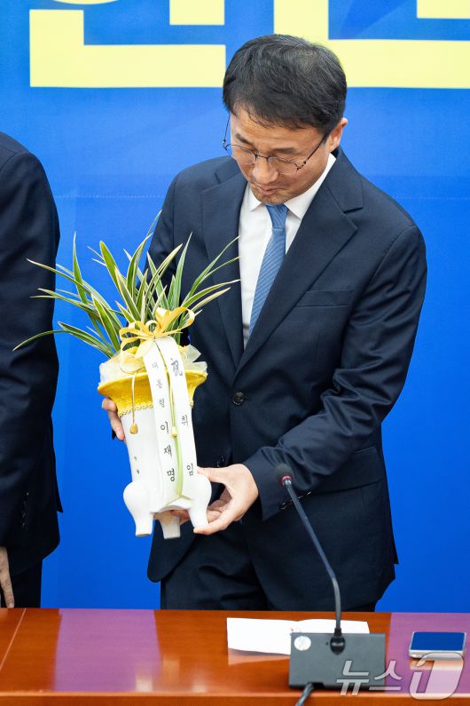 (서울=뉴스1) 유승관 기자 = 한병도 더불어민주당 신임 원내대표가 12일 서울 여의도 국회에서 우상호 청와대 정무수석을 접견, 이재명 대통령의 취임축하 난을 받아 들고 있다. 2026.1.12/뉴스1