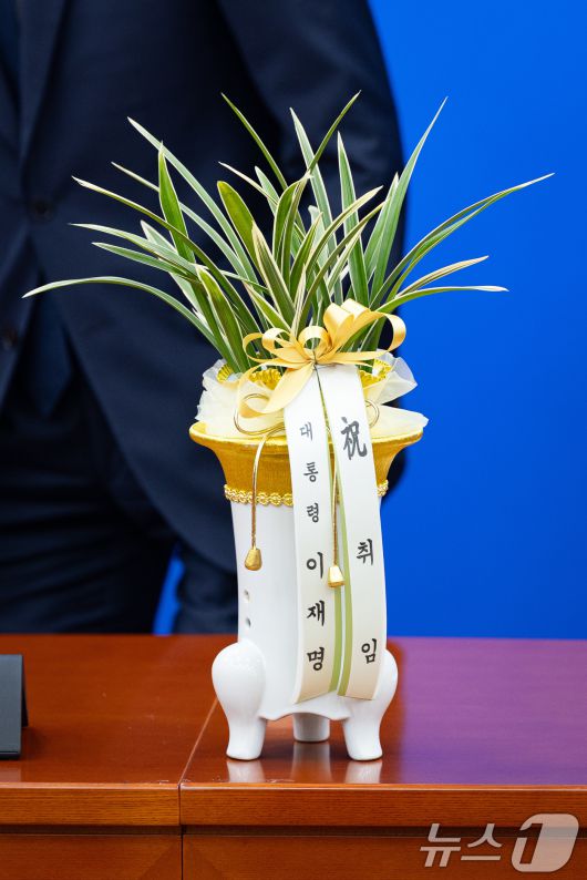 (서울=뉴스1) 유승관 기자 = 한병도 더불어민주당 신임 원내대표가 12일 서울 여의도 국회에서 우상호 청와대 정무수석을 접견, 이재명 대통령의 취임축하 난을 내려놓고 있다. 2026.1.12/뉴스1fotogyoo@news1.krCopyright ⓒ 뉴스1. All rights reserved. 무단 전재 및 재배포, AI학습 이용 금지.
