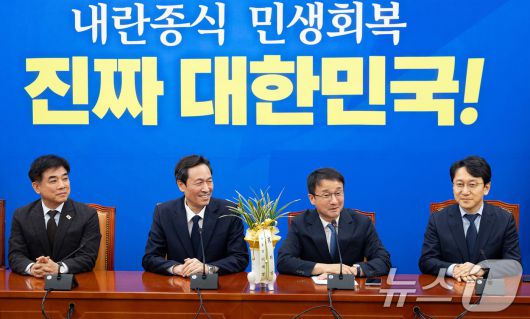 (서울=뉴스1) 유승관 기자 = 한병도 더불어민주당 신임 원내대표가 12일 서울 여의도 국회에서 우상호 청와대 정무수석을 접견하고 있다. 왼쪽부터 김병욱 청와대 정무비서관, 우 수석, 한 원내대표, 천준호 민주당 원내운영수석부대표. 2026.1.12/뉴스1