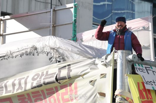 서울 중구 세종호텔 앞 도로의 구조물에서 고공농성 중인 고진수 민주노총 서비스연맹 관광레저산업노조 세종호텔지부장이 카메라를 향해 인사하고 있다.성동훈 기자 |
