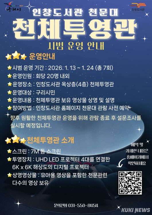 백경현 구리시장은 “인창도서관 천문대 천체투영관 시범운영을 통해 시민들이 천문우주과학을 보다 쉽고 친숙하게 접할 수 있을 것”이라며 “도심 속에서 별을 바라보며 휴식을 누릴 수 있는 새로운 문화공간이 되길 기대한다”라고 밝혔다.
