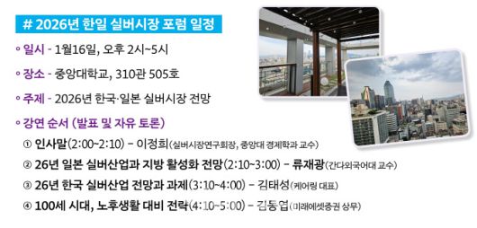 시사일본연구소는 실버시장연구회와 함께 오는 16일 오후 2시 중앙대학교 310관 505호에서 ‘2026년 한국과 일본 실버시장 전망 포럼’을 개최한다.
