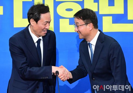 아시아투데이 이병화 기자 = 한병도 더불어민주당 신임 원내대표가 12일 이재명 대통령의 축하 난을 들고 국회를 찾은 우상호 청와대 정무수석과 인사를 나누고 있다 ⓒ "젊은 파워, 모바일 넘버원 아시아투데이"