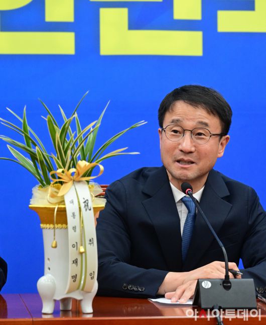 아시아투데이 이병화 기자 = 한병도 더불어민주당 신임 원내대표가 12일 국회에서 우상호 청와대 정무수석으로부터 이재명 대통령의 축하 난을 전달 받의 뒤 발언을 하고 있다. ⓒ "젊은 파워, 모바일 넘버원 아시아투데이"