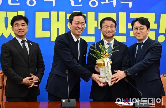 아시아투데이 이병화 기자 = 한병도 더불어민주당 신임 원내대표가 12일 국회에서 우상호 청와대 정무수석으로부터 이재명 대통령의 축하 난을 전달 받고 있다.