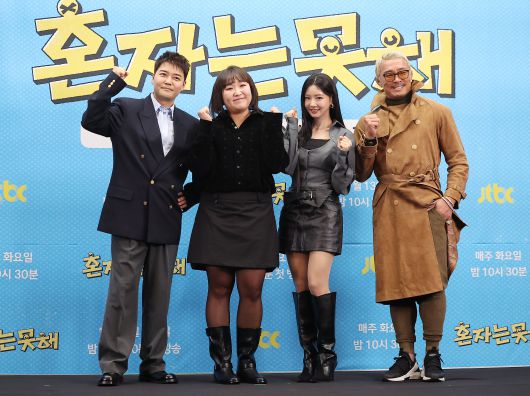 방송인 전현무(왼쪽부터), 개그우먼 이수진, 배우 이세희, 방송인 겸 격투기 선수 추성훈이 12일 오후 서울 마포구 스탠포드호텔코리아에서 열린 JTBC ‘혼자는 못 해’ 제작발표회에 참석해 포즈를 취하고 있다. /뉴스1 |
