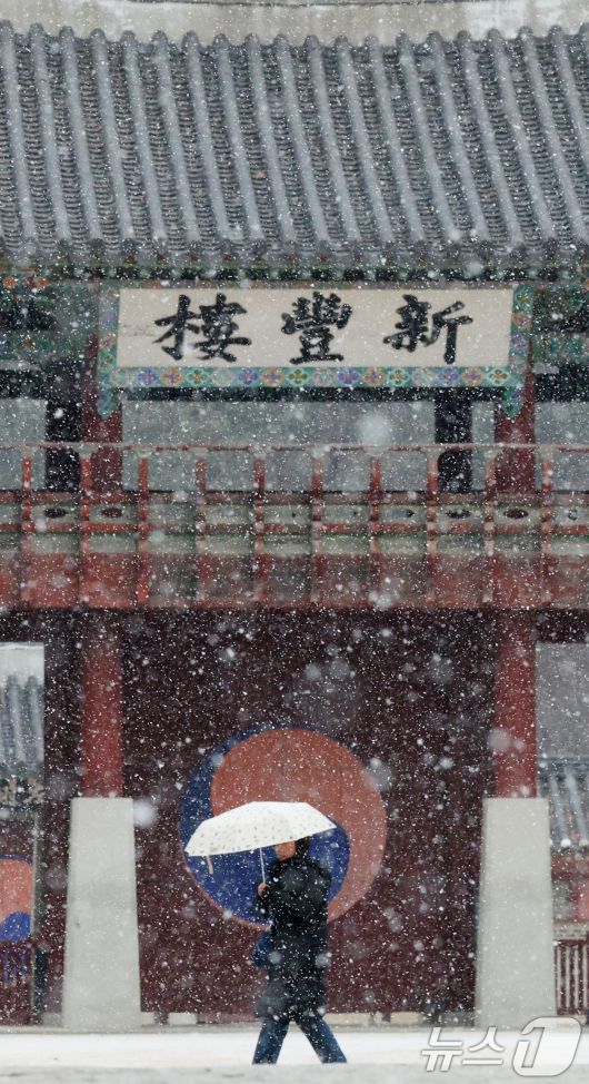 (수원=뉴스1) 김영운 기자 = 중부지방을 중심으로 눈이 내린 12일 경기 수원시 팔달구 화성행궁에서 시민들이 눈을 맞으며 걸어가고 있다. 2026.1.12/뉴스1kkyu6103@news1.krCopyright ⓒ 뉴스1. All rights reserved. 무단 전재 및 재배포, AI학습 이용 금지.
