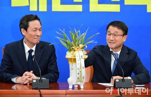 아시아투데이 이병화 기자 = 한병도 더불어민주당 신임 원내대표가 12일 국회에서 이재명 대통령으로부터 받은 취임 축하 난을 바라보고 있다.