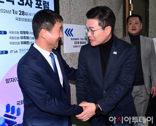 아시아투데이 이병화 기자 = 정원오 성동구청장이 12일 국회에서 한병도 더불어민주당 신임 원내대표 면담을 마친 후 인사하고 있다.