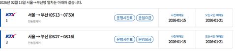 한편 코레일은 이번 설부터 모든 국민 대상 예매 기간을 기존 2일에서 3일로 확대하고, 노선별로 예매일을 분리 운영한다. 설 명절 승차권 예매는 15일부터 시작되며, 교통약자 사전 예매 이후 19일부터 모든 국민을 대상으로 일반 예매가 진행된다.
