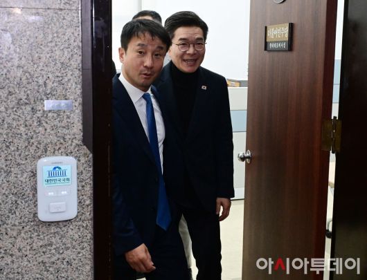 아시아투데이 이병화 기자 = 정원오 성동구청장이 12일 국회에서 한병도 더불어민주당 신임 원내대표 면담을 마친 후 원내대표실을 나서고 있다. ⓒ "젊은 파워, 모바일 넘버원 아시아투데이"