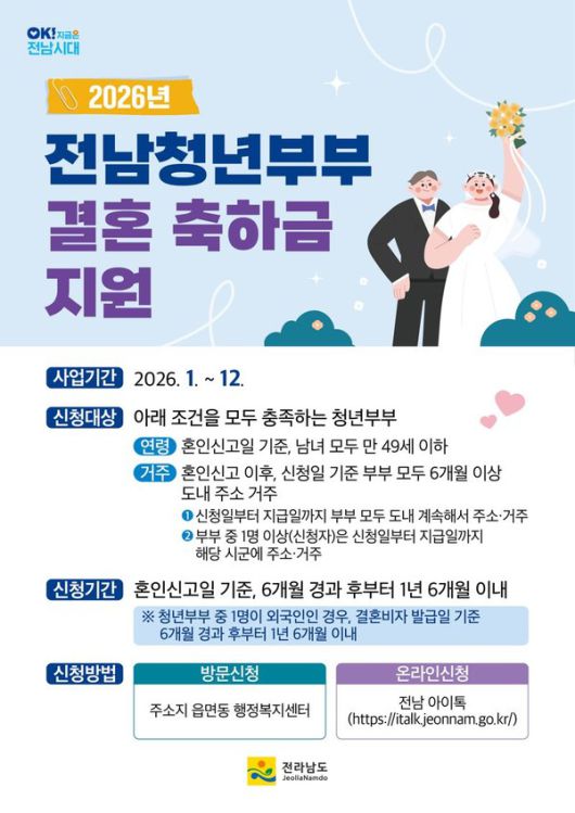 결혼축하금은 주소지 관할 읍·면·동 행정복지센터를 방문해 신청하거나 '전남 아이톡'에서 온라인으로 접수하면 된다.