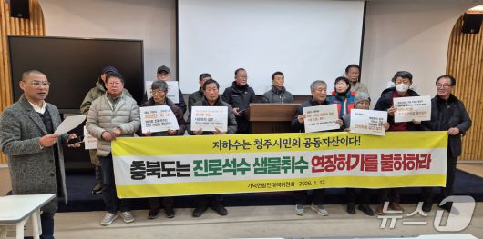 충북 청주 가덕면 주민들이 12일 충북도청 브리핑룸에서 기자회견을 해 도에 하이트진로석수의 샘물 사업 연장 불허를 촉구하고 있다. |
