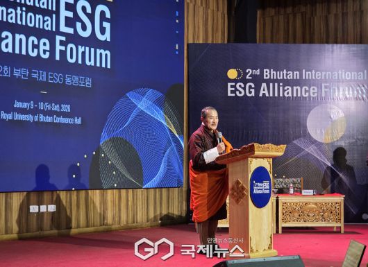 (부탄=국제뉴스) 유지현 기자 = 9일 부탄 팀푸시 부탄왕립대학교(RUB)에서 열린 제2회 부탄 국제 ESG 동맹포럼(The 2nd Bhutan International ESG Alliance Forum) 개막식에서 다쇼 케상 왕디(Dasho Kesang Wangdi) 부탄 왕실 추밀원 부의장이 축사를 했다.